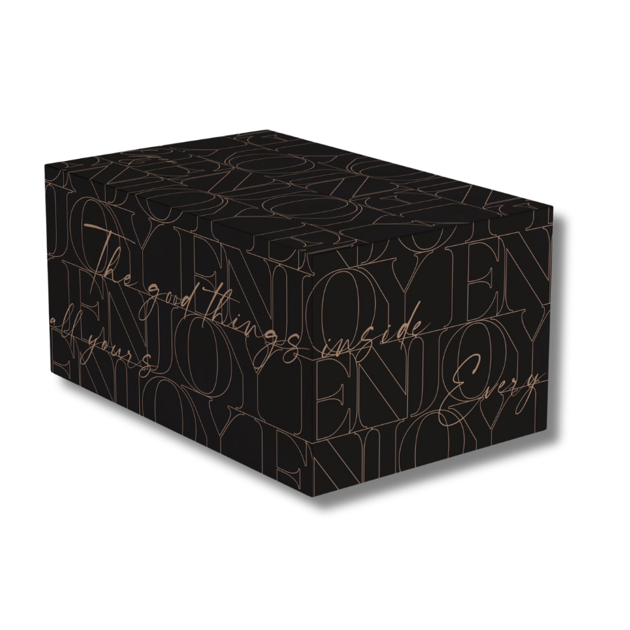 De Moments-doos straalt rust en klasse uit. Zwart als de winteravond, met in strakke kraftkleur het woord Enjoy, een kleine uitnodiging om stil te staan bij de mooie dingen. Perfect voor een geschenk dat niet alleen geeft, maar raakt. Voor collega’s, relaties of geliefden: deze doos maakt van elk cadeau een bewust moment.